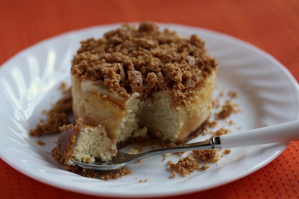 Alternatively, you can make individual cheesecakes in 1 cup ramekins. Grease eight 1 cup ramekins with melted butter. Line the bottoms with a parchment paper circle to fit your ramekin. Also grease the parchment paper after placing it inside. Divide crust into 8 ramekins. Press crust only into the bottom of the ramekin, bake crust for 10 minutes at 350°F, and let cool. Divide filling into 8 ramekins, bake for about 15-20 minutes at 350°F. The cheesecakes should be puffed and browned but still jiggle in the middle. Let cool. Pour topping over cheesecakes, bake for 5 minutes at 350°F. Let cool. Cover and refrigerate for about 1 hour. Run a knife around edges of each ramekin, and release cheesecake. Refrigerate until ready to serve. Garnish with crumbled Amaretti cookies before serving.