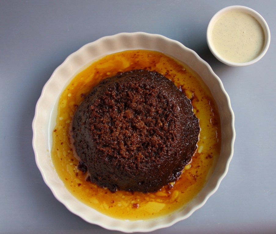 6. After 2 hours of simmering, remove the pudding bowl/pan out of the pot. Cool for about 5 minutes, and then turn onto a rimmed plate. Serve with vanilla bean custard.