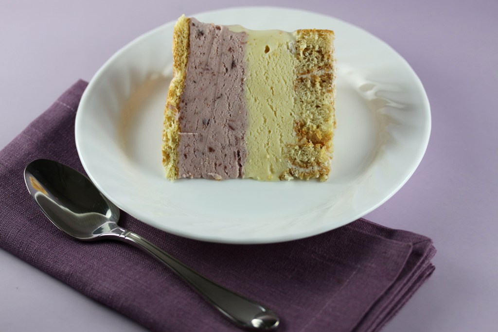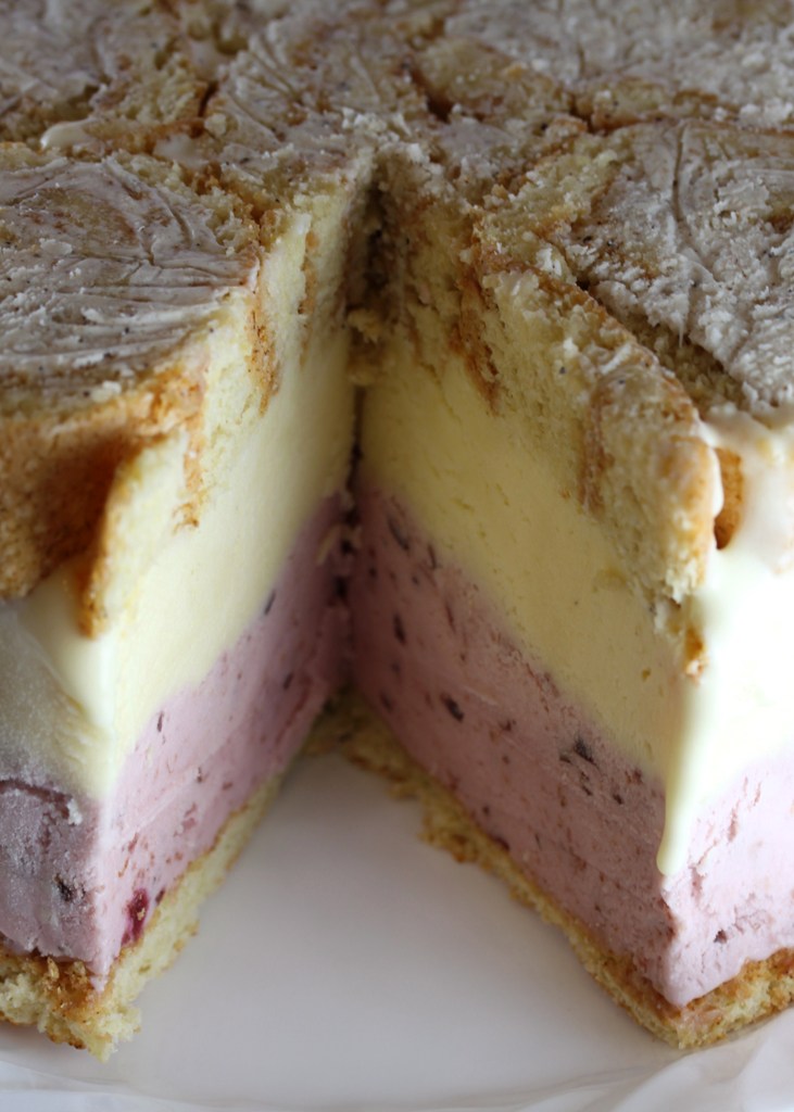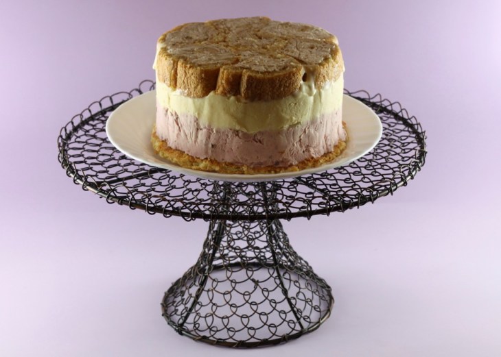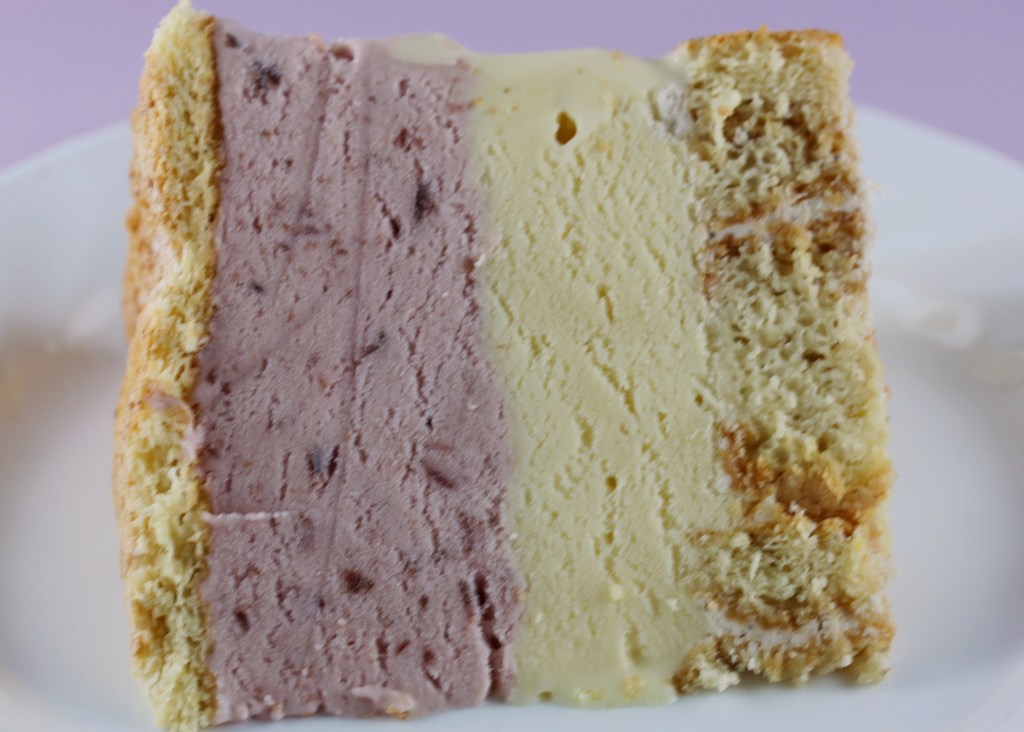 Once you have made all the components, you want to line a 6 by 3 inch round cake pan with plastic wrap. Slice the filled cake roll in 1 inch slices. Arrange the cake slices on the bottom of the pan or bowl, making sure to fill all gaps, and freeze for 1 hour. Spread the first layer of ice cream, freeze for 1 hour. Spread the second layer of ice cream, freeze for 1 hour. Place the piece of cake that you cut out to fit your pan on top of the last layer of ice cream and freeze for 4 hours before slicing. Remove the cake from the freezer, turn cake out of the pan, let sit for about 5 minutes and then slice.