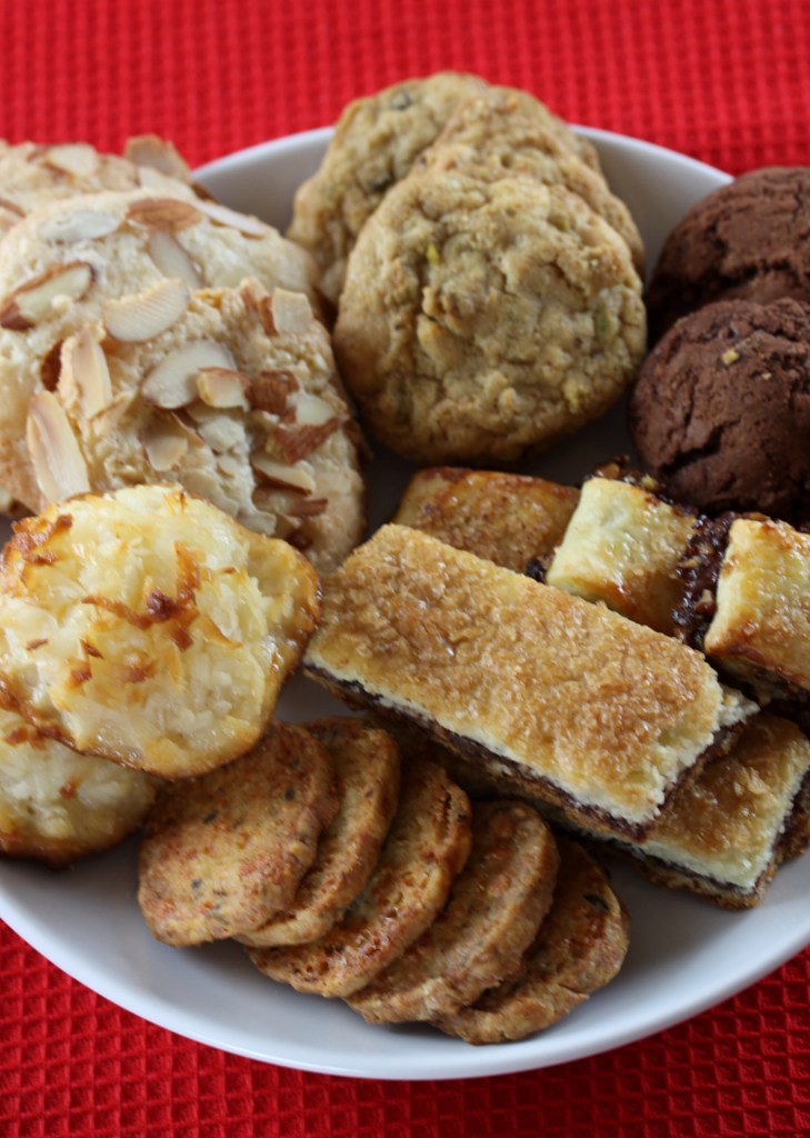 2009: Cherry White Chocolate Chunk Cookies, Apricot Raisin & Walnut Rugelach, Coconut Macaroons Drizzled with Chocolate, Chocolate Walnut Cookies, Gingersnap Sparkle Cookies, Shortbread Drizzled with Chocolate