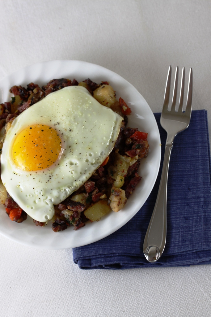 Once you have corned beef, there is a world of possibilities. The very first thing I made was corned beef hash. You cook some potatoes, onions, mushrooms, red bell peppers, and thinly cut corned beef in olive oil in a a cast iron skillet until the potatoes are cooked through, browned, and crispy. You sprinkle the hash with chopped flat leaf parsley, and top this delicious hash with a fried egg. Simple to make for any meal, breakfast, lunch, or dinner.