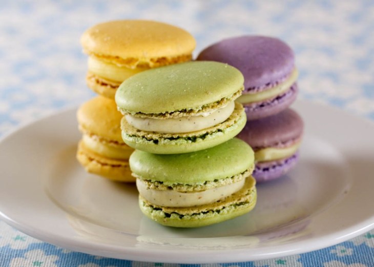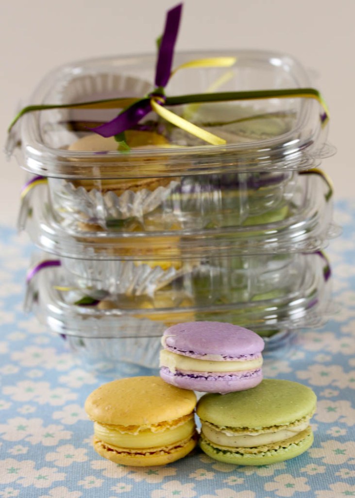 Meyer Lemon Macarons (yellow), Violet Macarons (purple), Vanilla Bean and Rum Macarons (green)