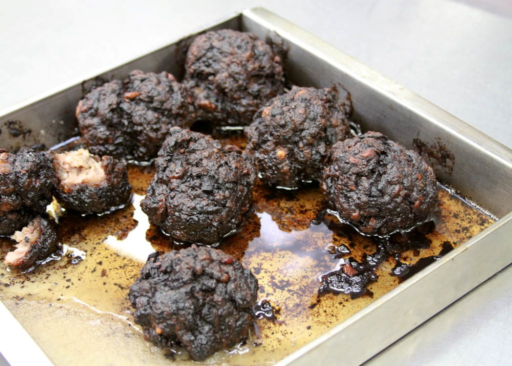 The fat is supposed to slowly melt away and in essence “confit” the balls. Half way through cooking you would cut an X half way through each ball so that the fat would moisten and cook the inside of the pate. We placed the pate in a convection oven (apparently a big no-no), and instead got a pool of fat and burnt up tops. It still tasted delicious.