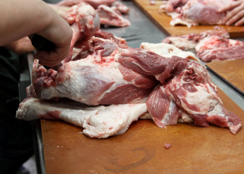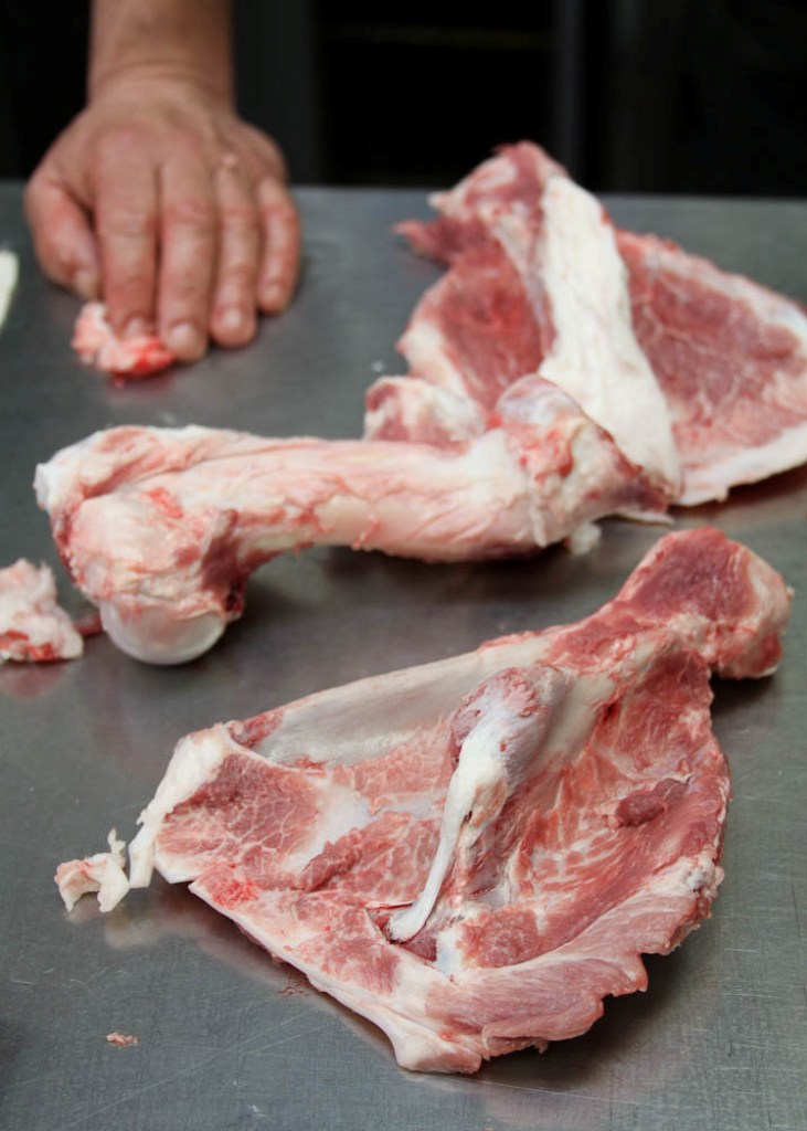 He proceeded to remove the shoulder and back leg. Then he moved on to releasing the spine and ribs in order to get to the tenderloin, and later the belly.