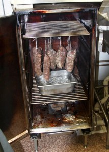For the first charcutepalooza challenge I got a little wine fridge and I so wish that a whole ham leg would fit in there so that I could make some cured ham. Of course, a whole ham won’t fit into my little wine fridge. We learned from Dominique and Kate how to make a viable option: noix de jambon. Little pieces from the ham are tied, seasoned with salt and pepper, cold smoked for an hour or two, and cured for a short period of time. Another option is the filet sec, the tenderloin prepared the same way. The tenderloin and the noix the jambon in the smoker: