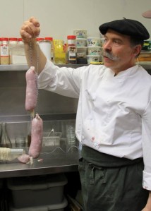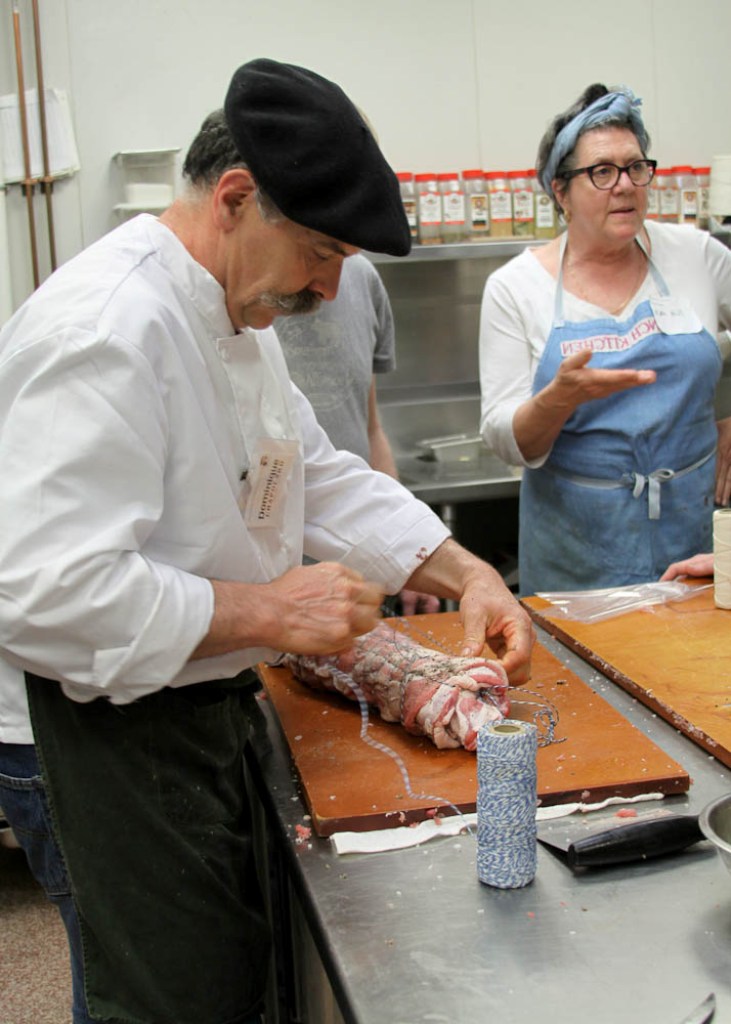 Dominique demonstrating how to tie the saucisson in bundles of two for hanging.