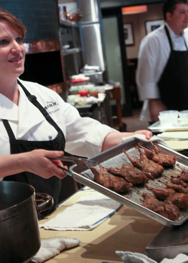 Chef Amy Brandwein shows us the quail after they were roasted in the 600°F oven. The quail was then shredded and became the star of the ragu sauce that was served with the pappardelle.