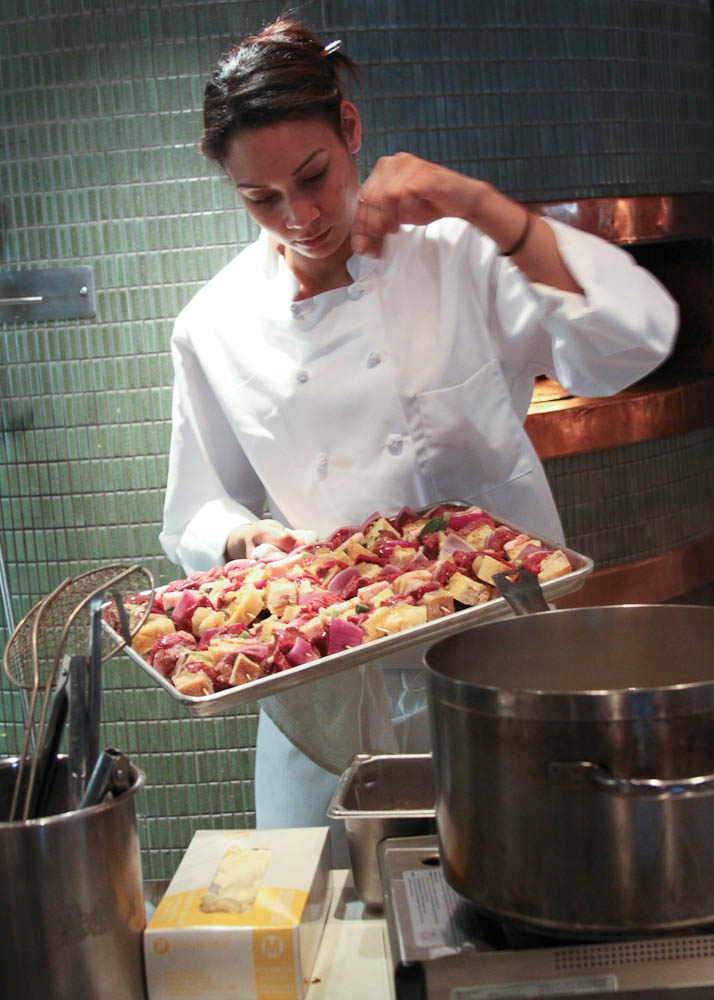 Here Chef Amy demonstrates how to assemble the spiedini. They consisted of chunks of hanger steak, pancetta, chicken liver, thick croutons, poached apples, spring onions, and sage leaves.
