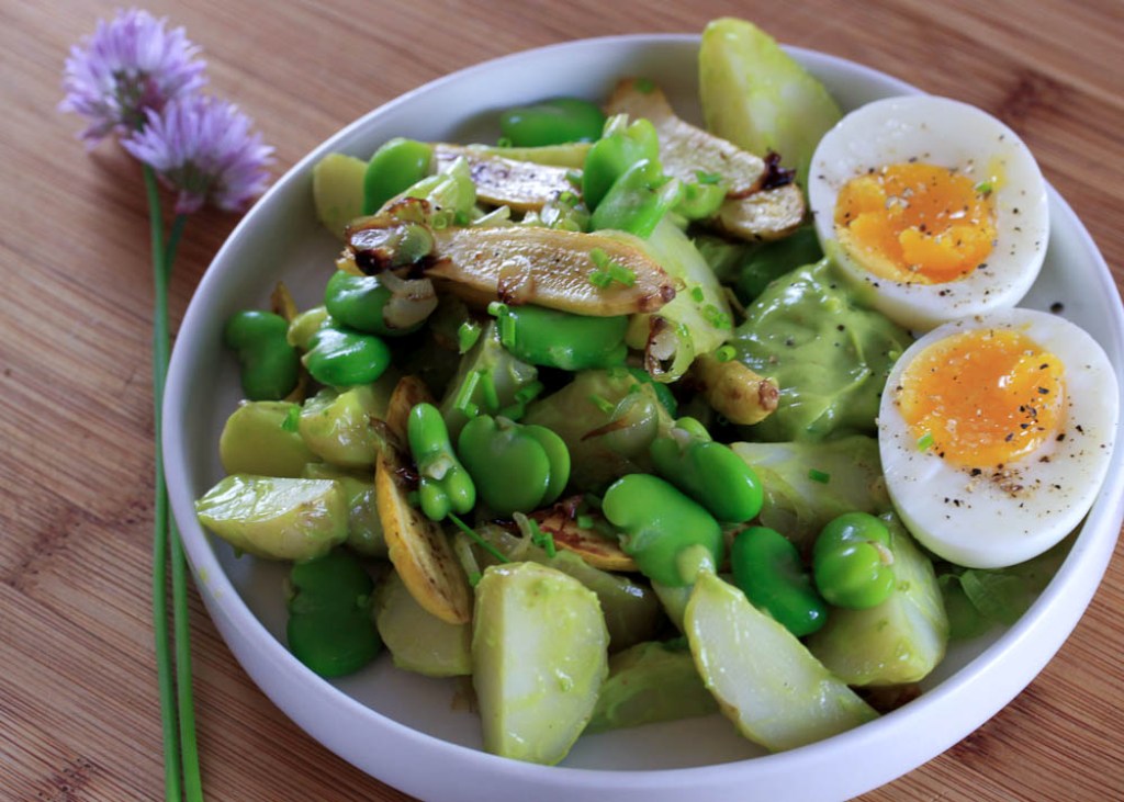 5. Toss the potatoes with some of the dressing. Sprinkle with chives. Divide among four plates. Top with egg, fava beans, leeks, and zucchini. Serve with extra dressing on the side.