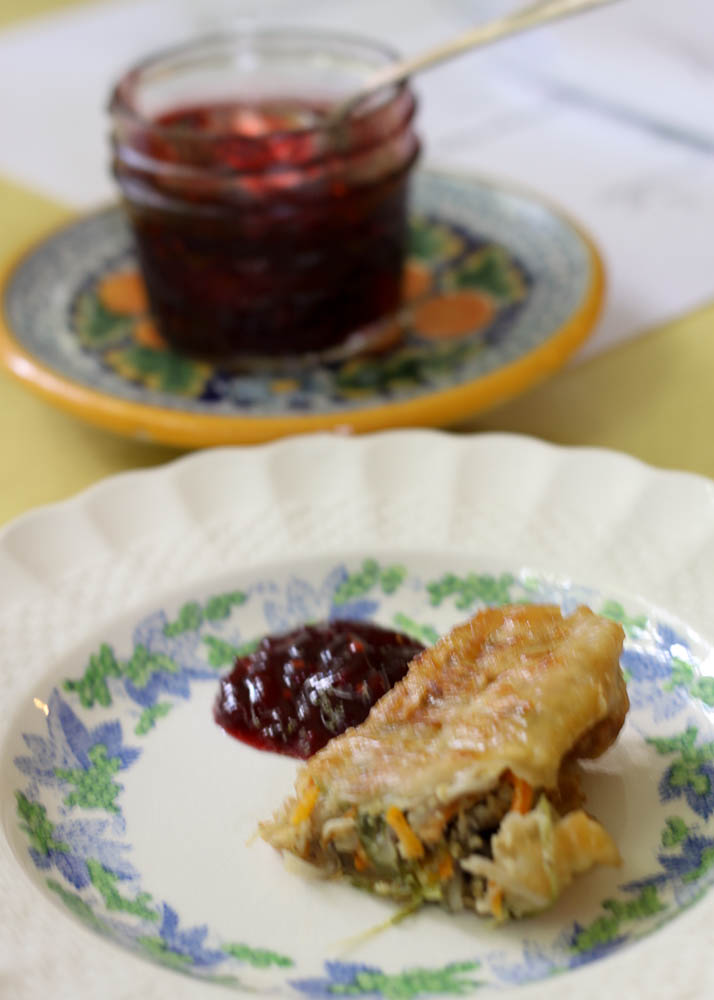 My favorite part: tasting! Spring rolls with the red plum sauce we just made. This sauce is complex, spicy, savory, and sweet.