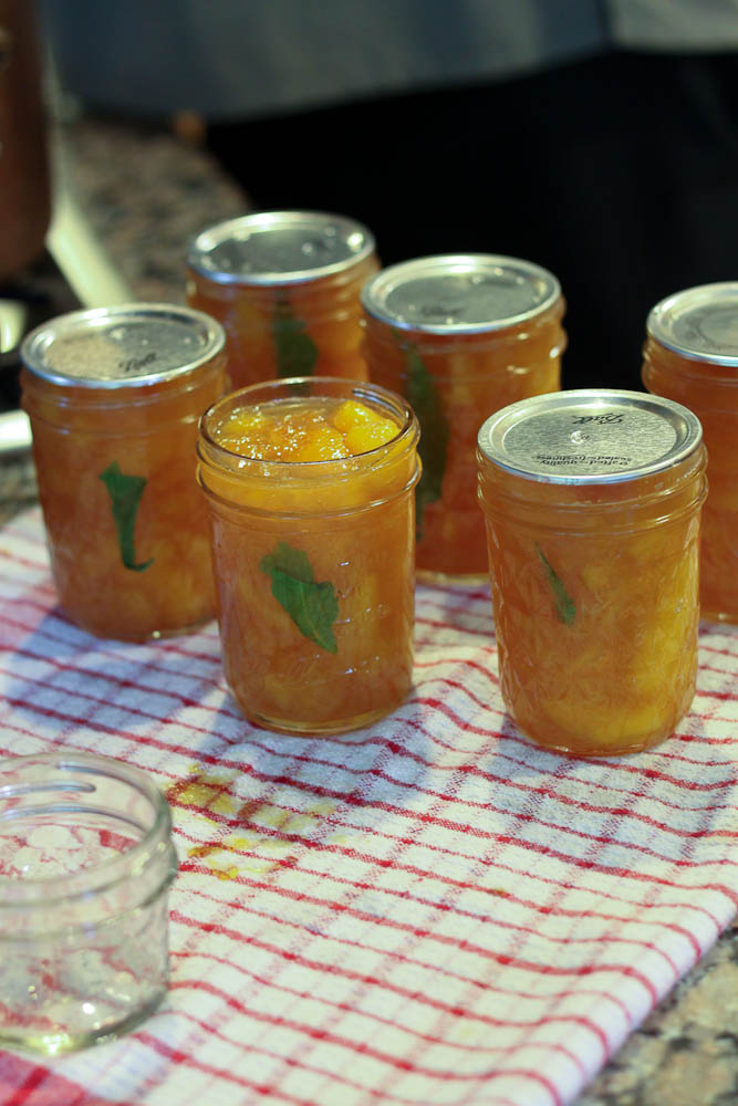 The peach & lemon verbena preserves before processing in the water bath. These taste so fresh, like a ripe juicy peach with just a hint of the lemon verbena. We learned how to decorate the jars with lemon verbena leaves.