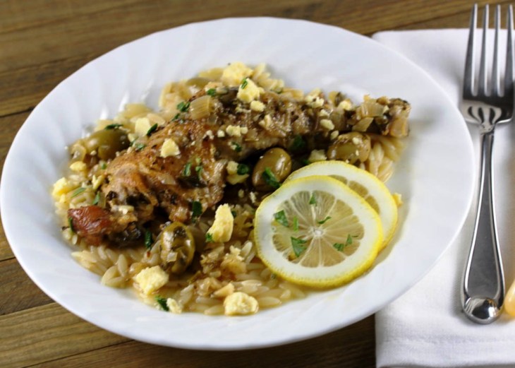 4. Return the pan to the stove over low heat. Add the shallots and cook, stirring until just softened but not browned, for 1 to 2 minutes. Add half of the parsley, the garlic, and the oregano, and cook for 1 minute. Stir in the lemon zest and juice, wine, and olives, and then return the chicken to the pan.