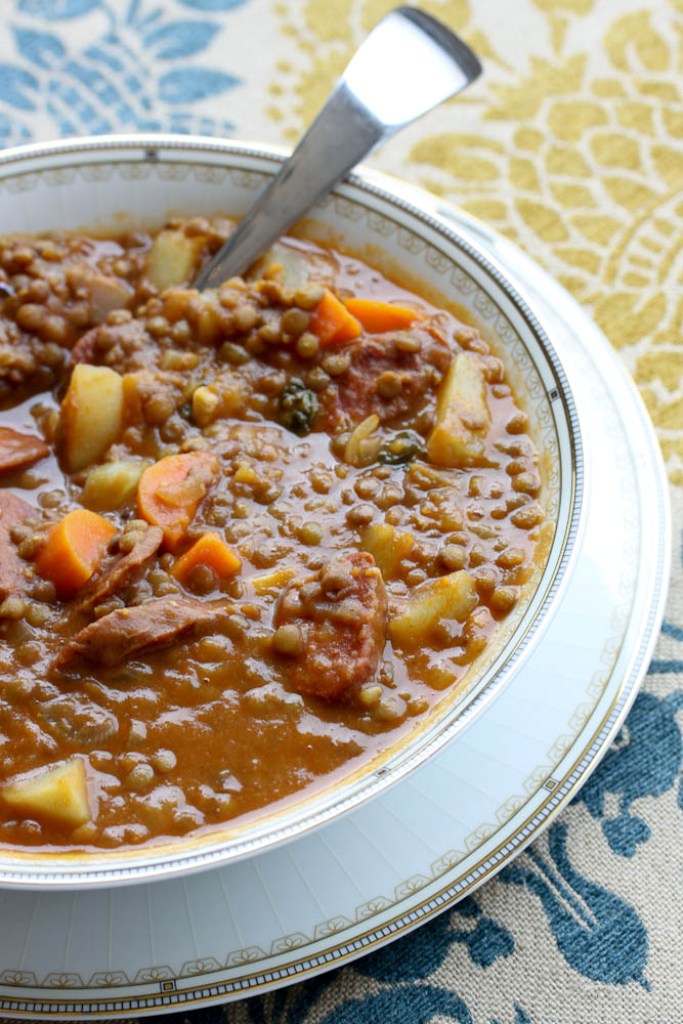 4. Remove the onion, garlic, carrot, parsley, and bay leaf from the lentils. Add the mixture from the skillet, and the potatoes. Add water if necessary. Taste for seasoning, add just a bit of salt and pepper if necessary. Cook until the potatoes are tender, about 15-20 minutes.