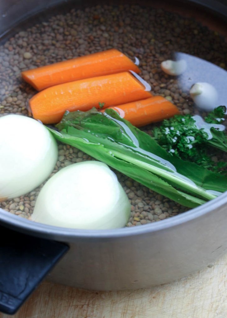 1. Place lentils, 2 onion halves, 2 whole garlic cloves, 3 pieces carrot, parsley, and bay leaf in a large pot and cover with water by two inches. Bring to a boil, reduce to simmer, cover, and cook for 30 minutes. Check the lentils after 15 minutes, stir, and add more water if necessary.