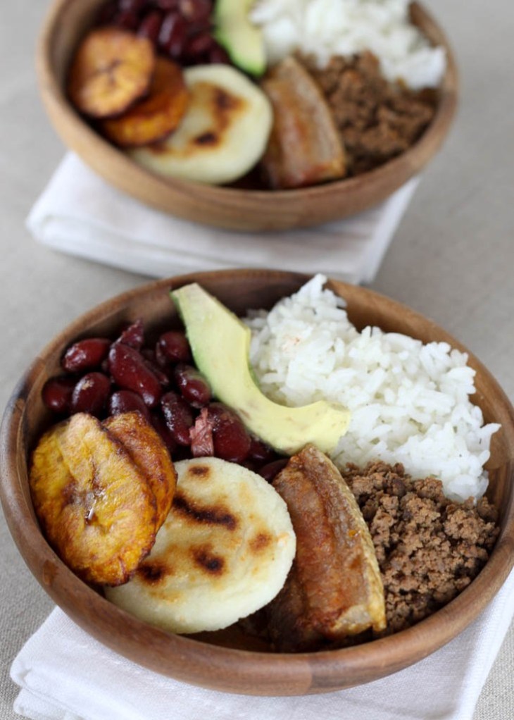 Serve the beans, arepa, and carne en polvo with white rice, fried plantain slices, fried pork belly, and avocado. The bandeja paisa is traditionally served with a fried egg on top, I skipped the fried egg this time. Buen provecho!
