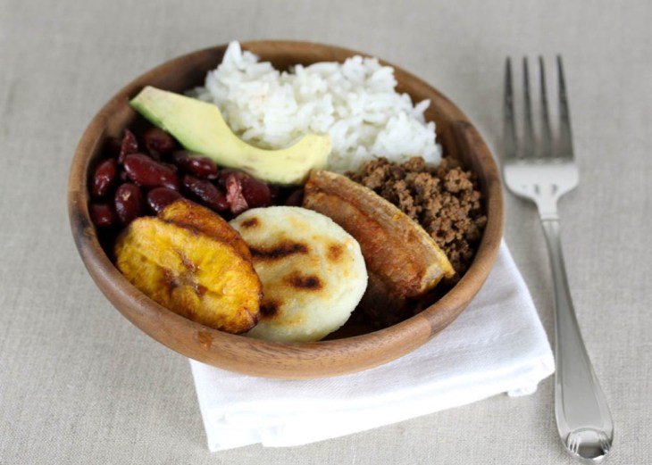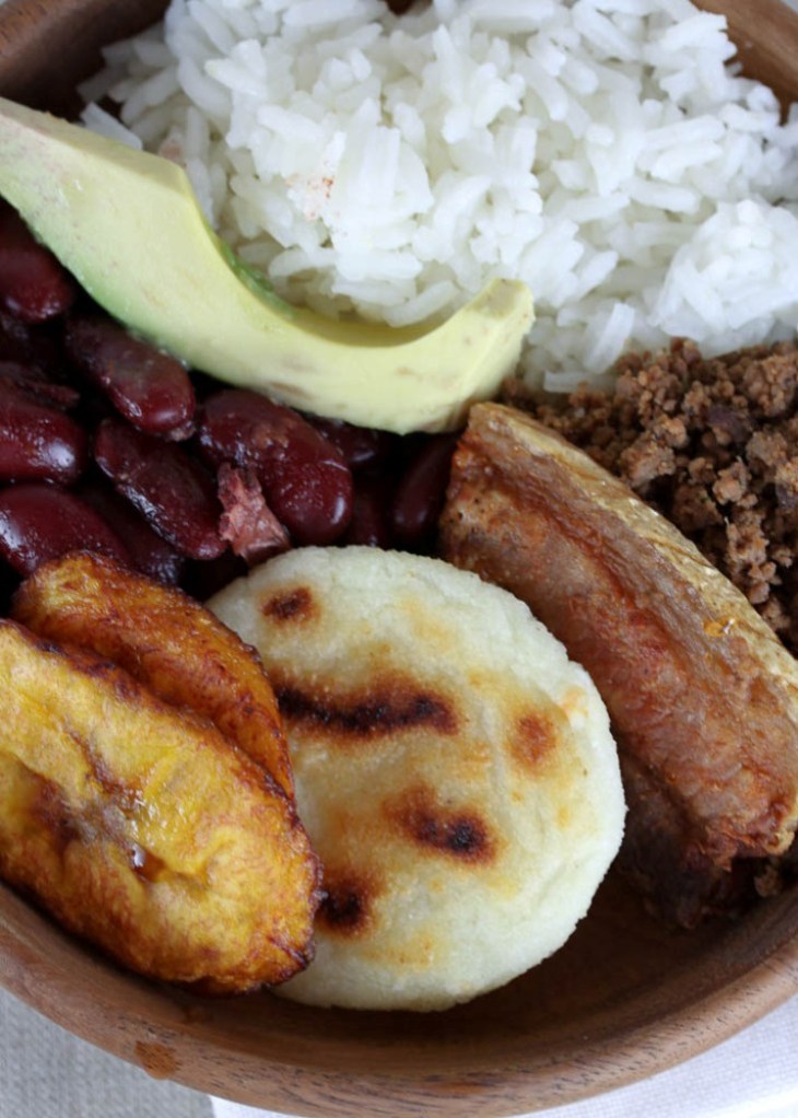 There as many variations of the bandeja paisa as there are cooks. I learned how to make it with beans, carne en polvo, and miniature sized arepas. Also on the bandeja paisa, you will find white rice, fried plantain slices, avocado, fried pork belly, and a fried egg. It sometimes also has sausage, and/or black pudding.
