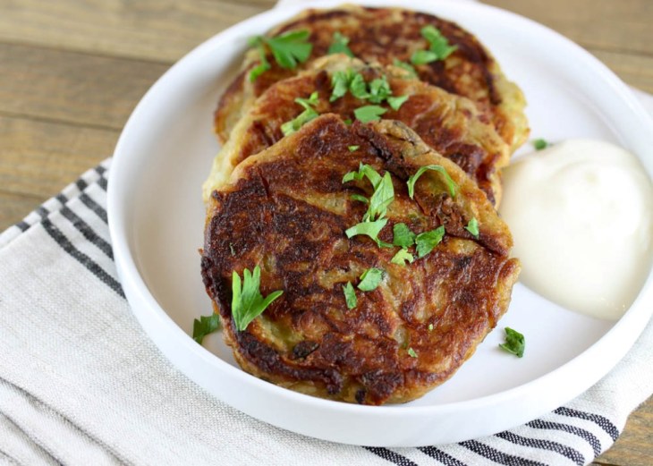 5. Heat 1 tablespoon butter and 1 tablespoon oil on a large skillet. Form each pancake using a 1/3 cup measure. Don’t over crowd the pan. Cook until browned on both sides. Transfer to the oven. Cook the remaining mixture, adding more butter/oil if necessary. Remove them from the oven and serve with sour cream. Garnish with green onions and serve with sour cream. Makes 10.