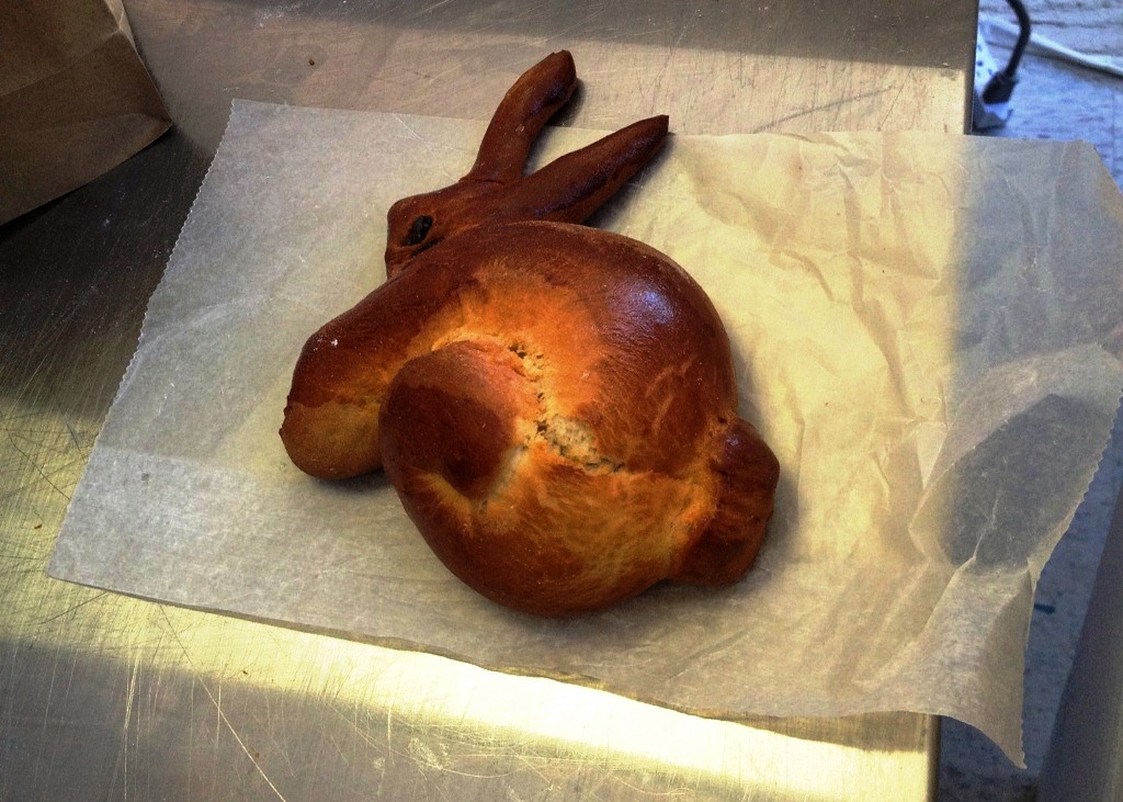 I walked away with a French baguette, a bacon gruyere baguette, and a special bunny shaped loaf that they are making for the Easter holiday.