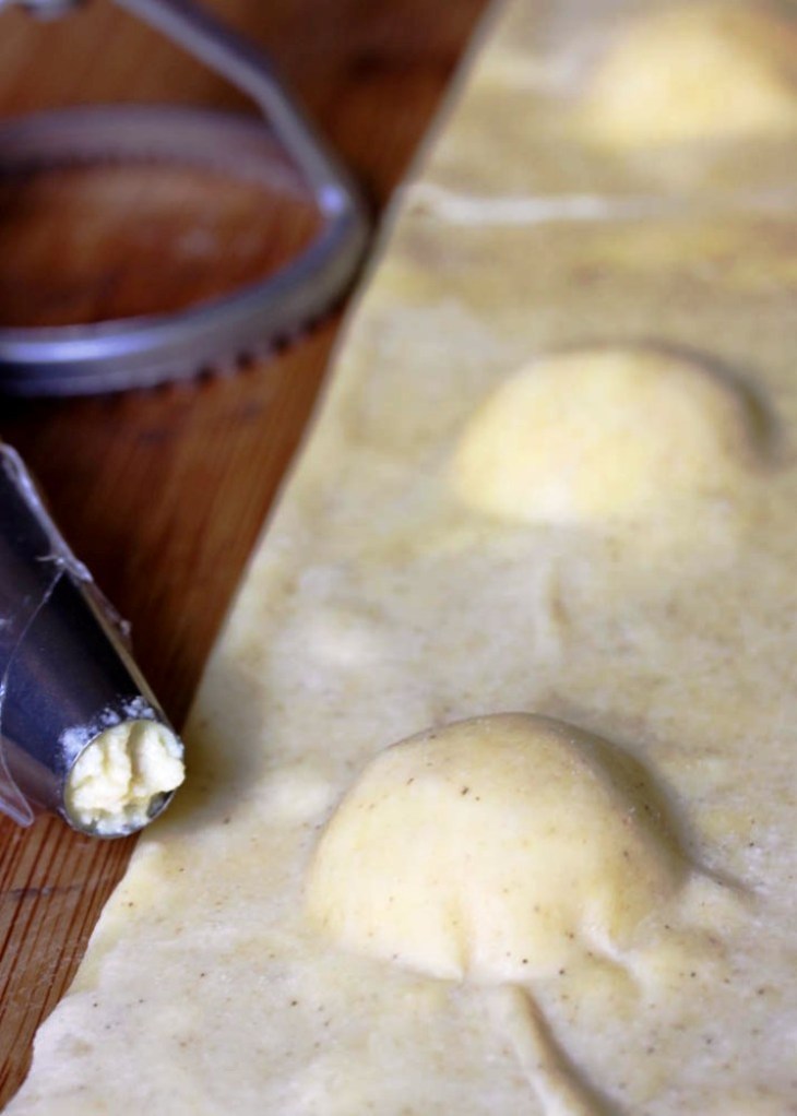 3. Lightly flour a large wood board or counter. Run one pasta sheet under warm water for about 10 seconds on each side. Let the water drain away from the pasta sheet. Place pasta sheet on floured surface. Blot the top of the pasta sheet with a paper towel. Place a tablespoon of filling every 3.5 inches on the pasta sheet. Brush the pasta all around the filling with egg wash. Run another pasta sheet under warm water on each side, and place this on top of your filling. Cut the ravioli and make sure all the ravioli are all well sealed. The round ravioli stamp that I used is 3 inches. You can also cut the ravioli with a cookie cutter, a pizza cutter, or a knife.