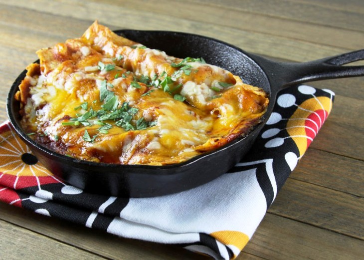 3. Assemble the enchiladas: Pour some of the enchilada sauce on the bottom of a casserole. Then pour the rest of the enchilada sauce into a shallow bowl. Dip each tortilla in the enchilada sauce, remove excess, stuff with filling, and place seam side down on the casserole dish. Repeat with all tortillas. Pour remaining enchilada sauce on top. Sprinkle with cheese. Bake in a pre-heated 325°F oven, for 10-15 minutes, until the sauce is bubbly and the cheese is melted. Garnish with cilantro, and serve with sour cream.