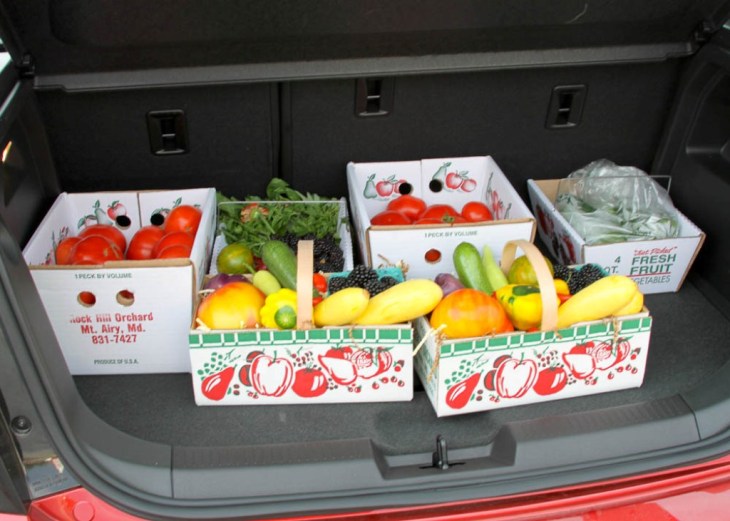 Butler’s Orchard sent us home with a basket of fresh produce that included heirloom tomatoes, squash, peppers, and big plump black berries. We packed up all of our goodies in the trunk of the Sonic and headed home with a lot of fresh local produce!