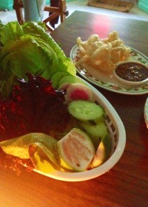 Side salad: romaine lettuce leaves, Thai eggplant, radishes, cucumbers, and basil