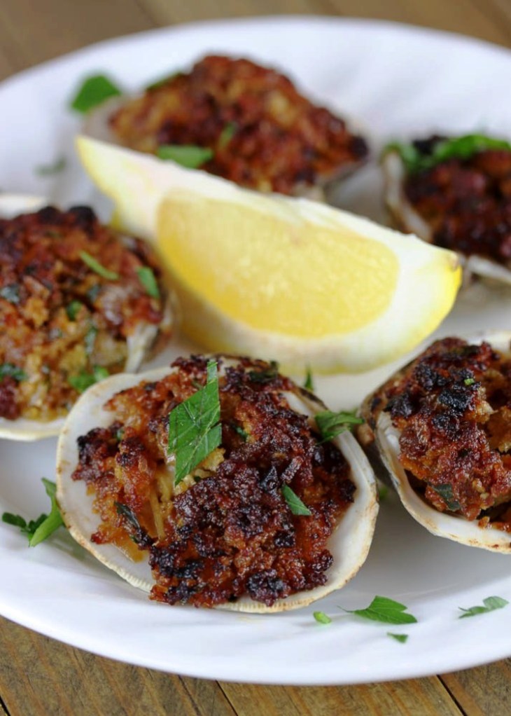 5. Heat your broiler and broil the clams until the stuffing is golden brown, 3-5 minutes. Watch them closely, you don’t want them to burn. Transfer to a plate with tongs and serve with a lemon wedge.