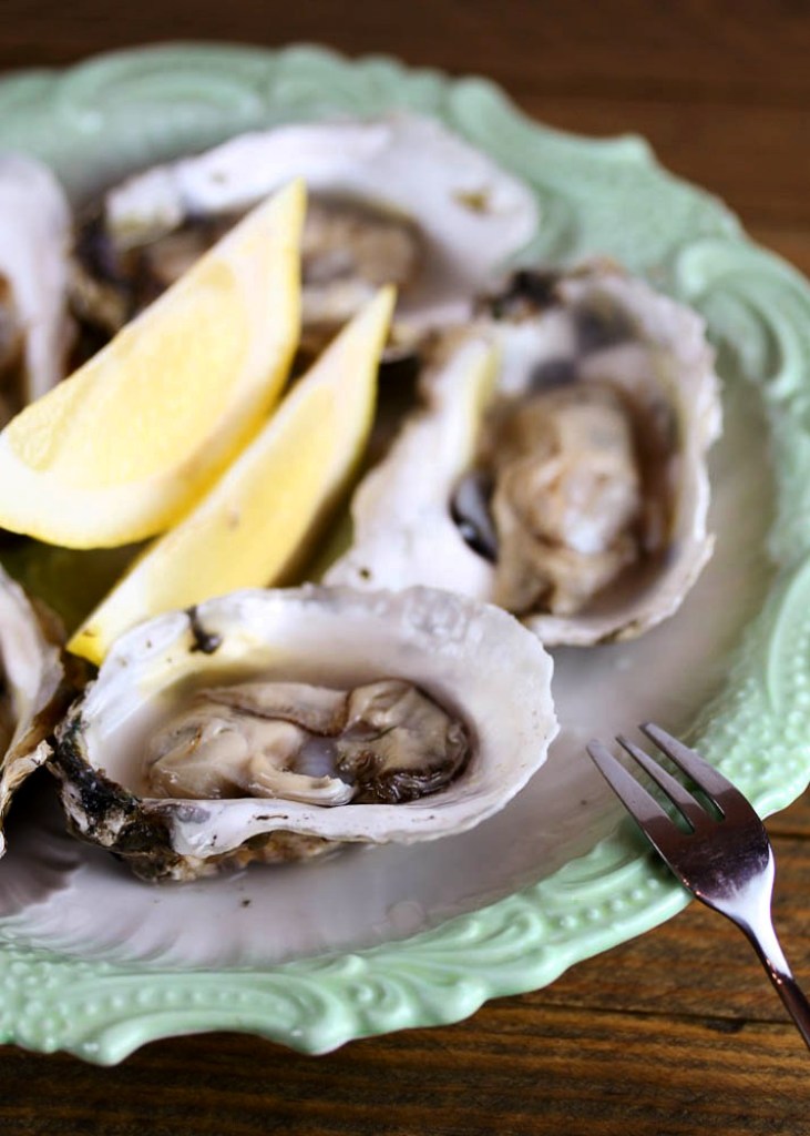 Best way to serve oysters: on a plate with a lemon wedge.