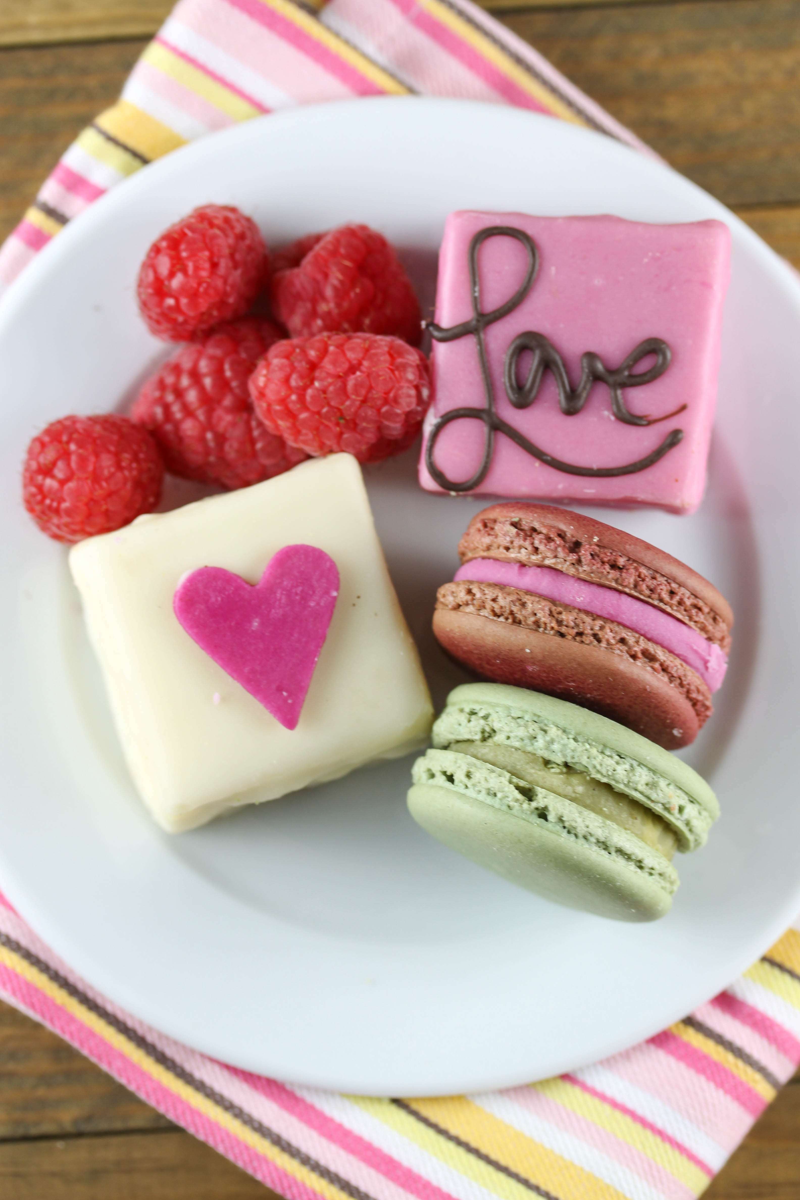 Hope you have a happy Valentine’s day! The chocolate cake is long gone, but I will be indulging in these petit fours & macarons.