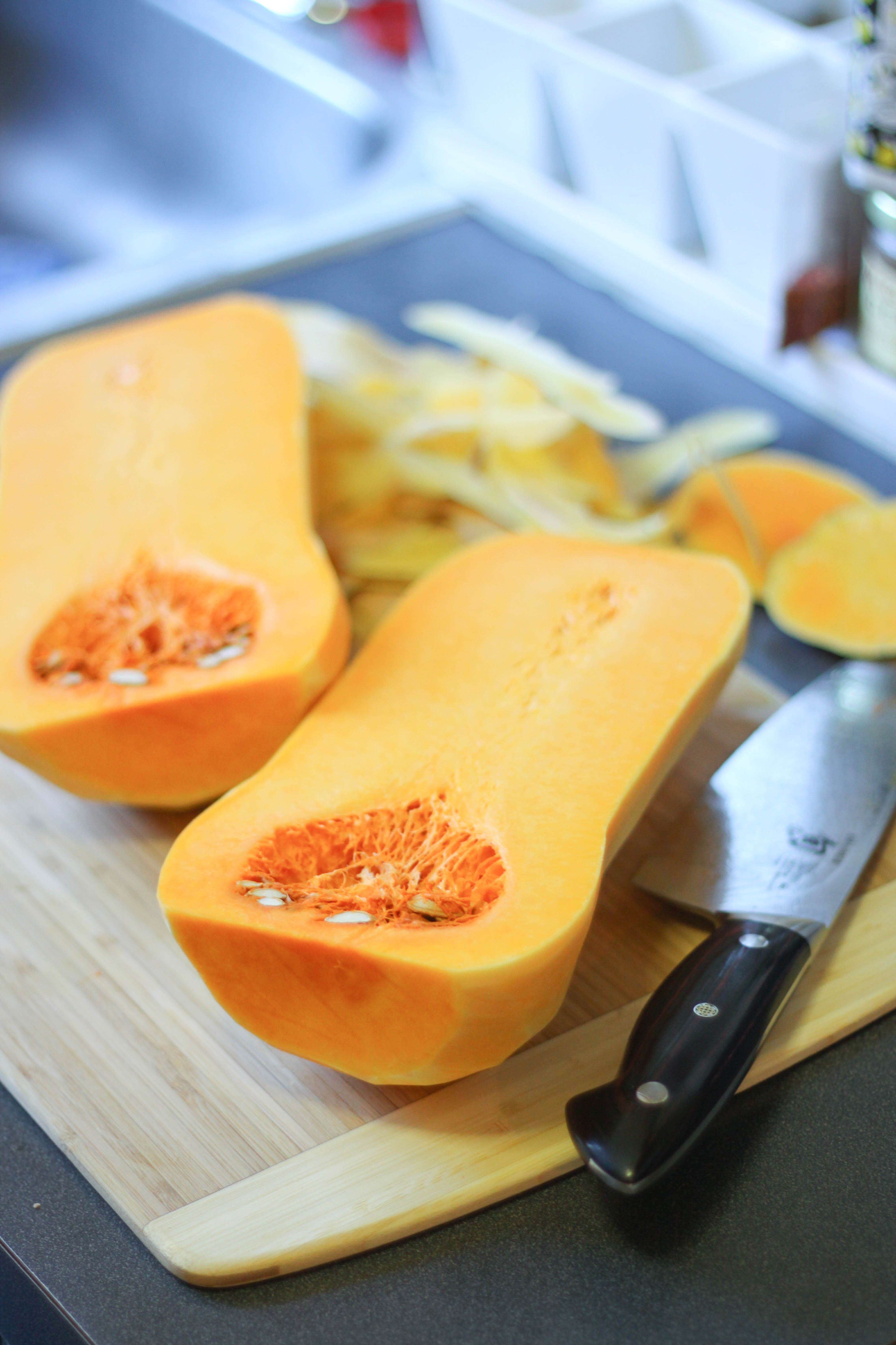 Peel the butternut squash, cut in half and remove the seeds. Cut into 1 inch cubes.