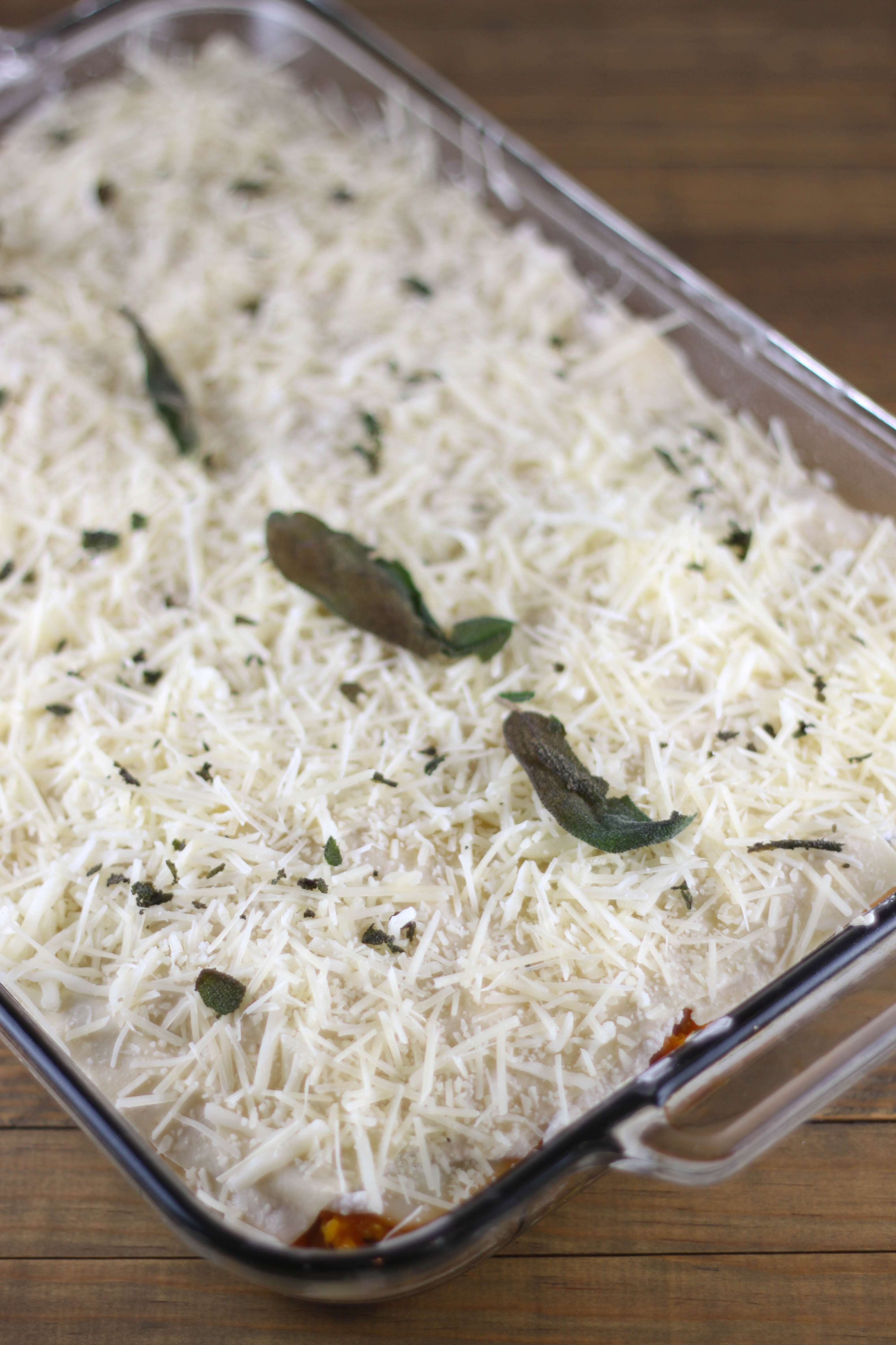 In a small skillet, add 1 tablespoon olive oil and sage leaves. Cook until lightly browned and crisp. Drain on a paper towel. Set a few leaves aside to decorate the lasagna. Crumble the rest into the butternut squash mixture and mix well.