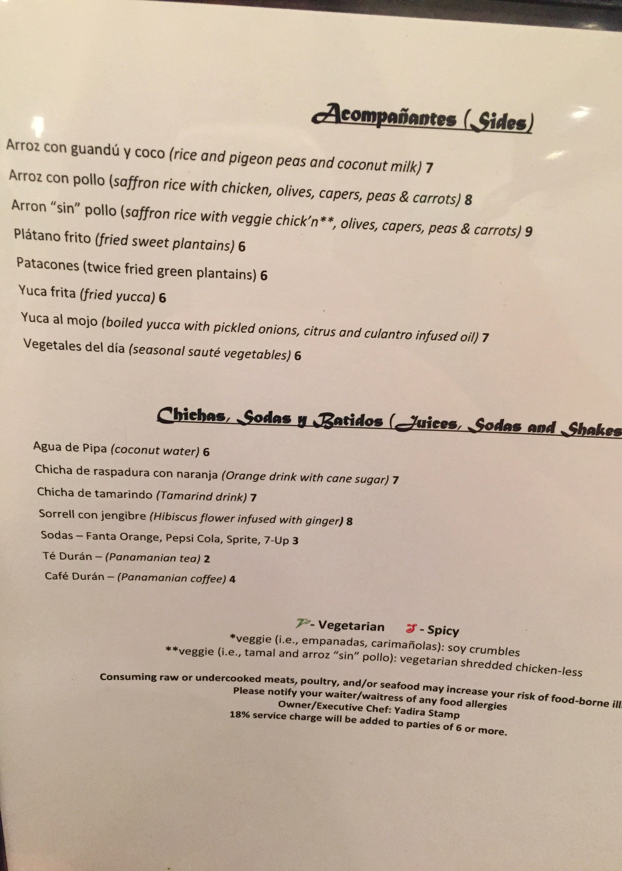 Esencias Panameñas opened in July 2015, and it is located at 3322 Georgia Avenue, NW in the Petworth neighborhood. It is evident that great care was taken to renovate and decorate the space. My first impression was positive; the restaurant is immaculately clean and welcoming. The hostess/waitress was friendly and welcomed us in in Spanish.