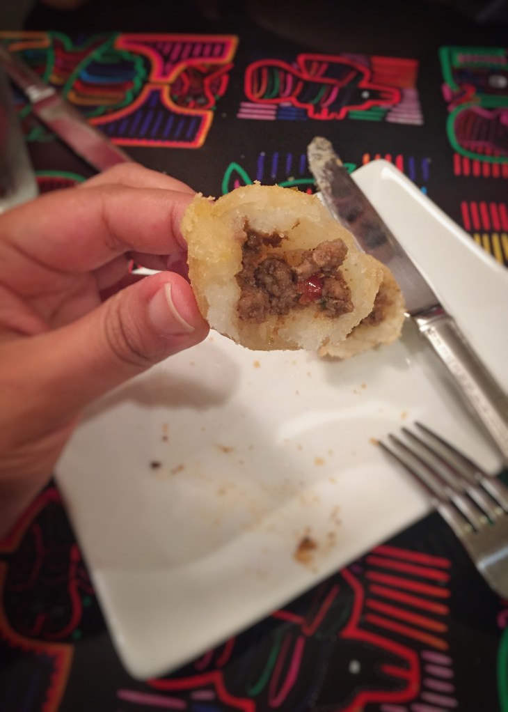 For an appetizer, we ordered the carimañolas—fried yucca dough encasing a ground meat filling. It took 30 minutes for us to get our appetizer, but the carimañolas were worth the wait. They were perfect. The yucca dough had a great consistency. Since carimañolas are fried, a lot of times they can be really greasy. These were not greasy at all. The filling was savory and succulent.