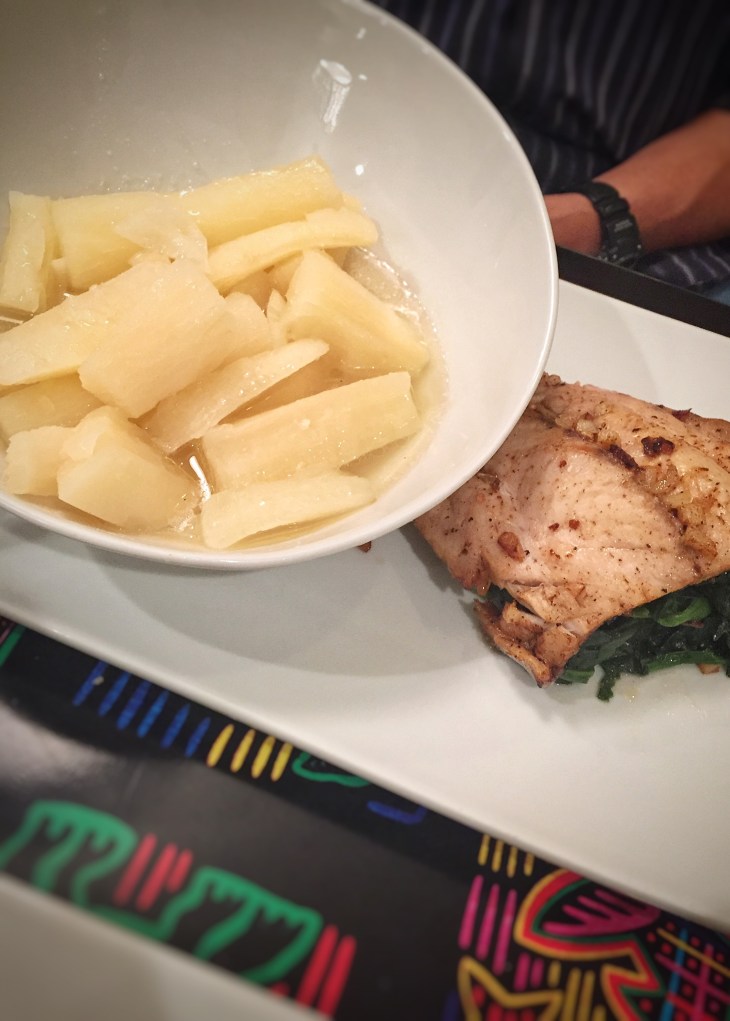 Filete de Covina al Ajillo Con Espinaca y Yuca al Mojo